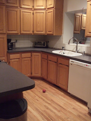 As you can see, the cabinets and doors are very traditional. Not to mention UGLY. But replacing the cabinets (or even painting them) just isn’t going to happen as soon as I’d like. The traditional style and exposed hinges (not even sure what color to call that – dirty bronze maybe?) make it pretty much impossible to use the more streamline modern stainless pulls that we are typically drawn to. I love modern pulls, but they’d look terrible in this kitchen.