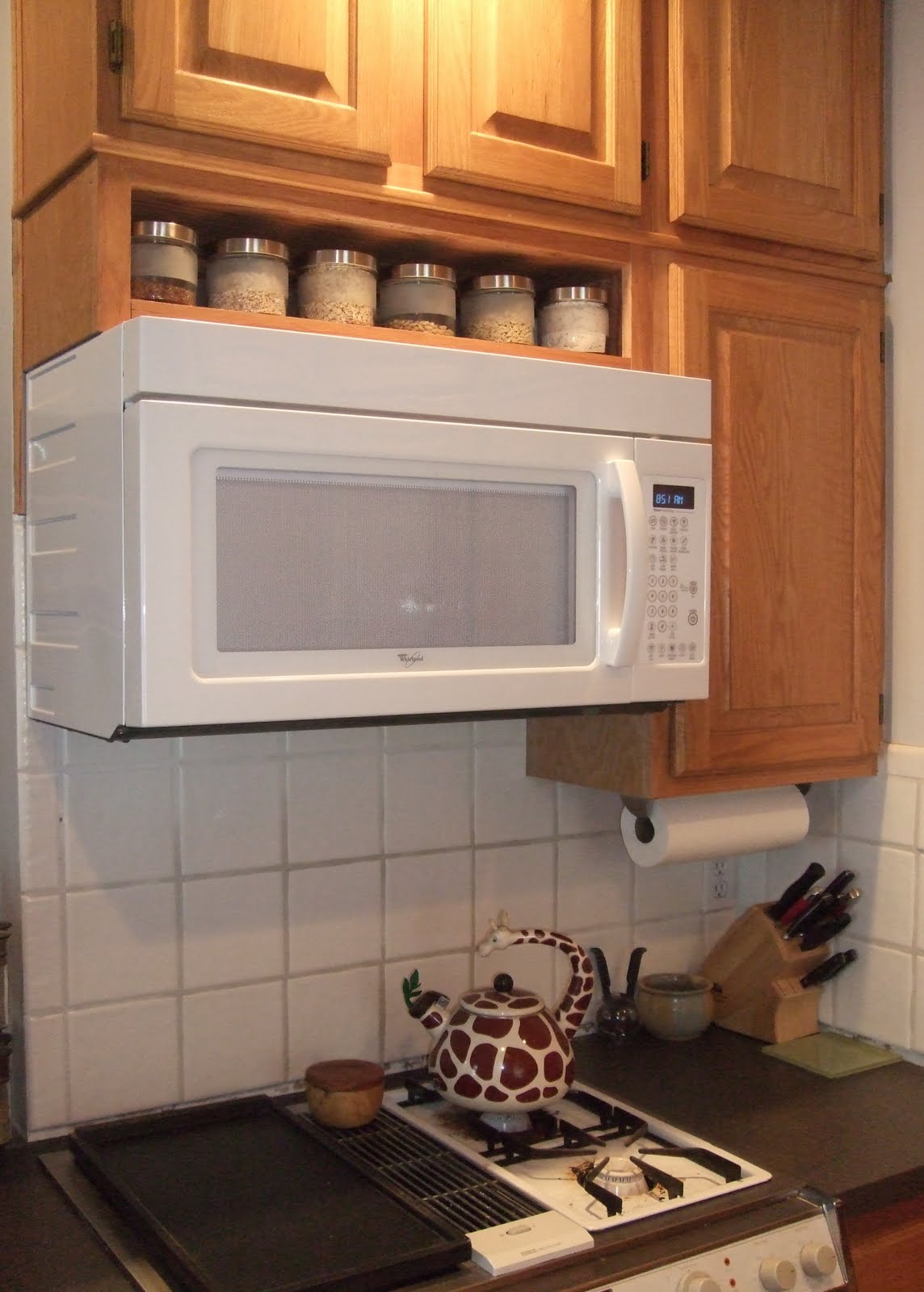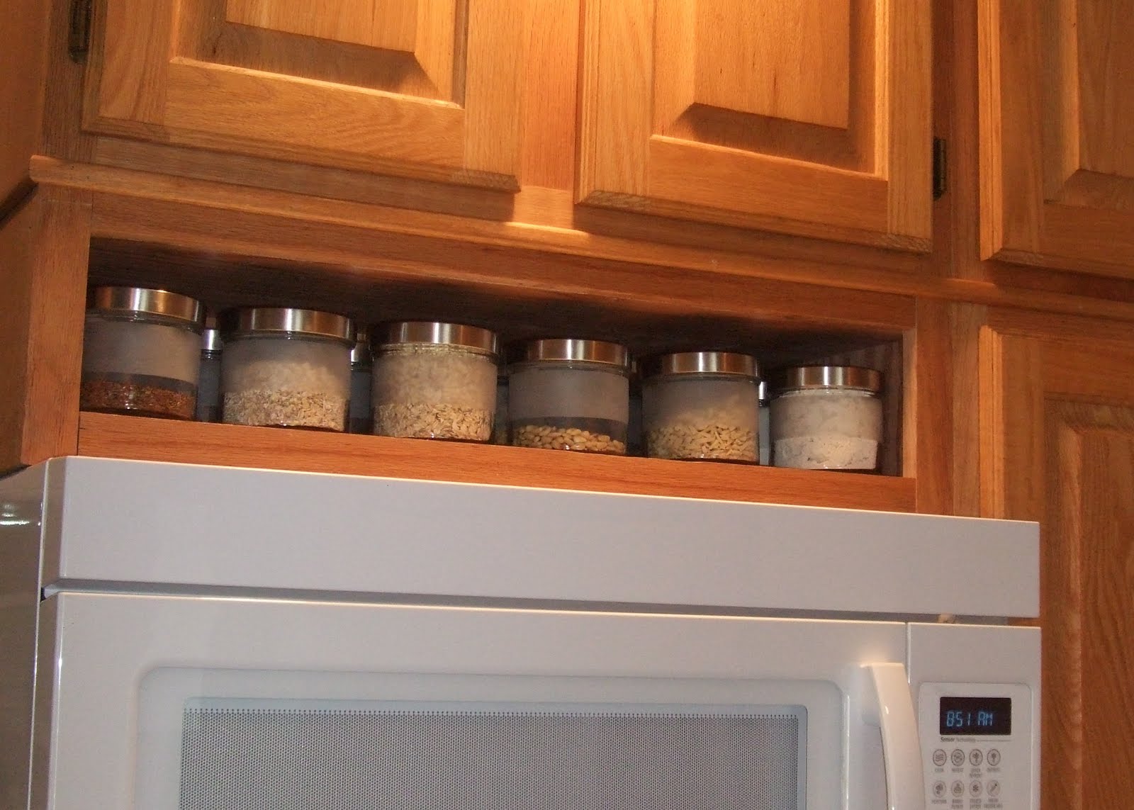 I really like having the short open shelf there. The jars are a nice touch, helping to break up the expanse of Honey Oak.