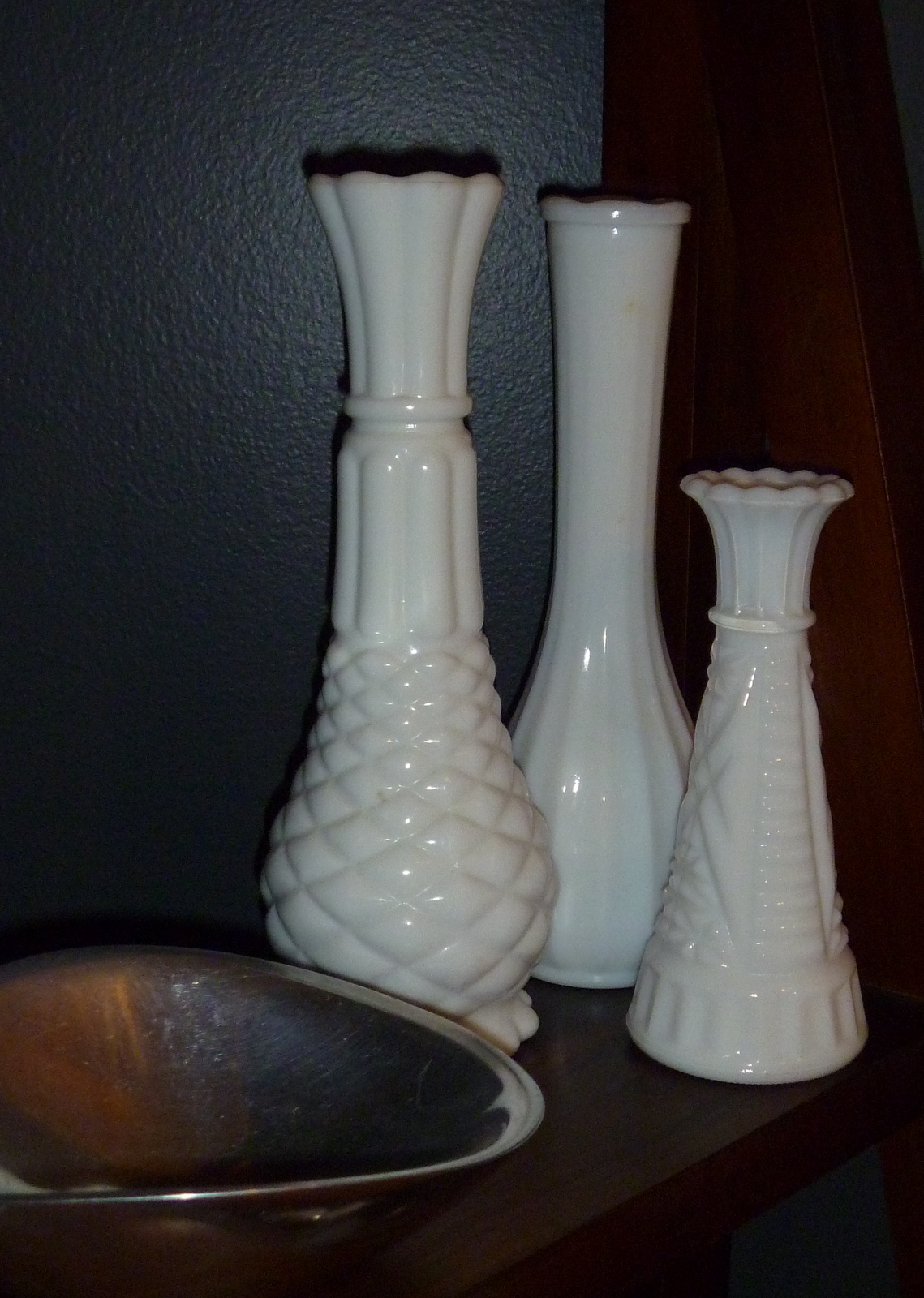 I love my milk glass vases. I picked them up at various thrift stores one day last year. I bought 4 vases for a whopping $ 3.50, and there were so many there it was hard to choose which ones I wanted! Because of the stark contrast against our black walls, these inexpensive vases are one of the most dramatic elements in our dining room.