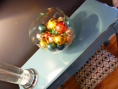 I have a centerpiece on my kitchen table just like this, except the ornaments are all bright green and gold. Lol, and I totally got the idea from someone else too.